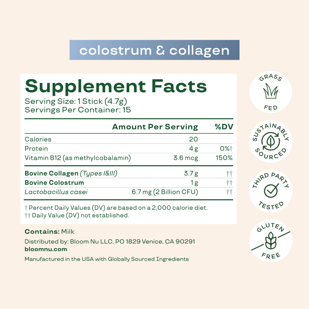 All the bioactive beauty benefits of Colostrum — packed into convenient single-serving sticks! Our advanced 3-in-1 formula combines nutrient-rich colostrum, grass-fed collagen peptides, and premium probiotics to balance gut health, support immunity, and nourish hair, skin & nails from within.