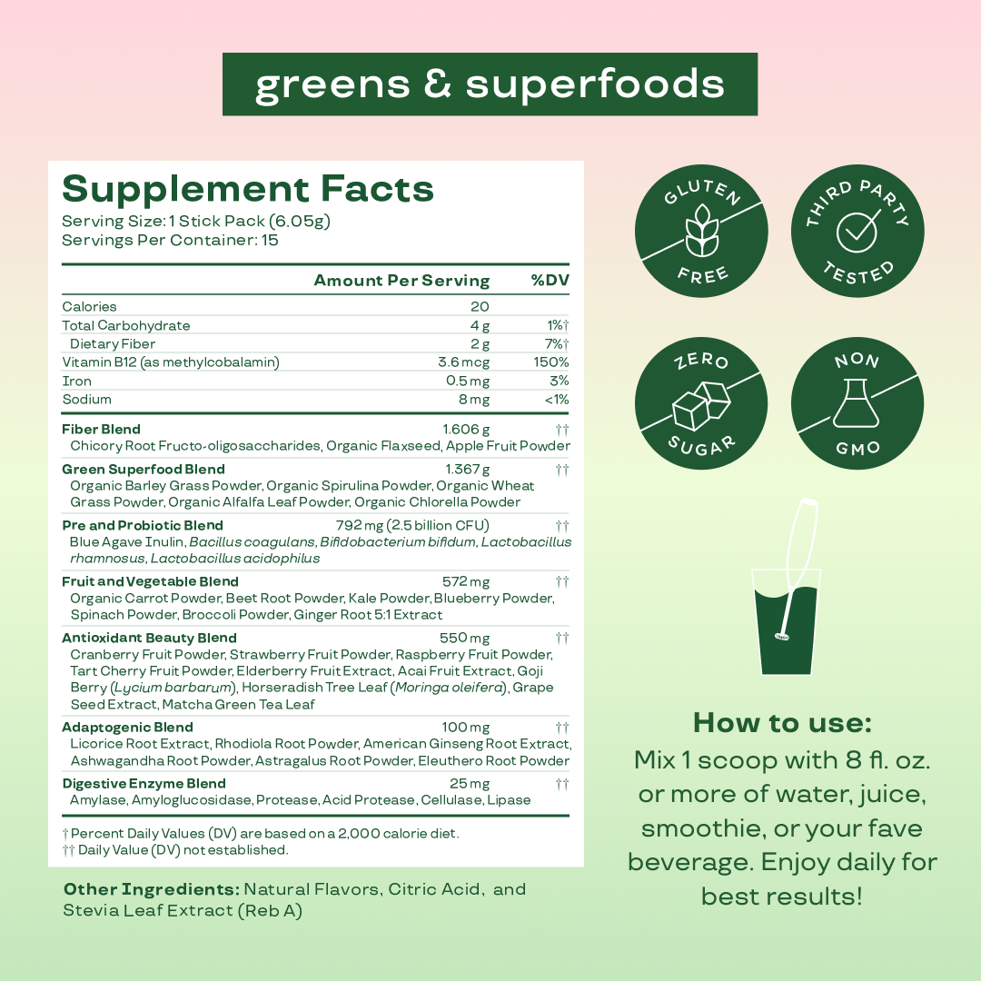 Meet your new travel bestie! Made with 38 good-for-you ingredients, Greens help relieve bloat, support digestion, and promote energy in the most delicious way, so you can feel your best wherever life takes you!