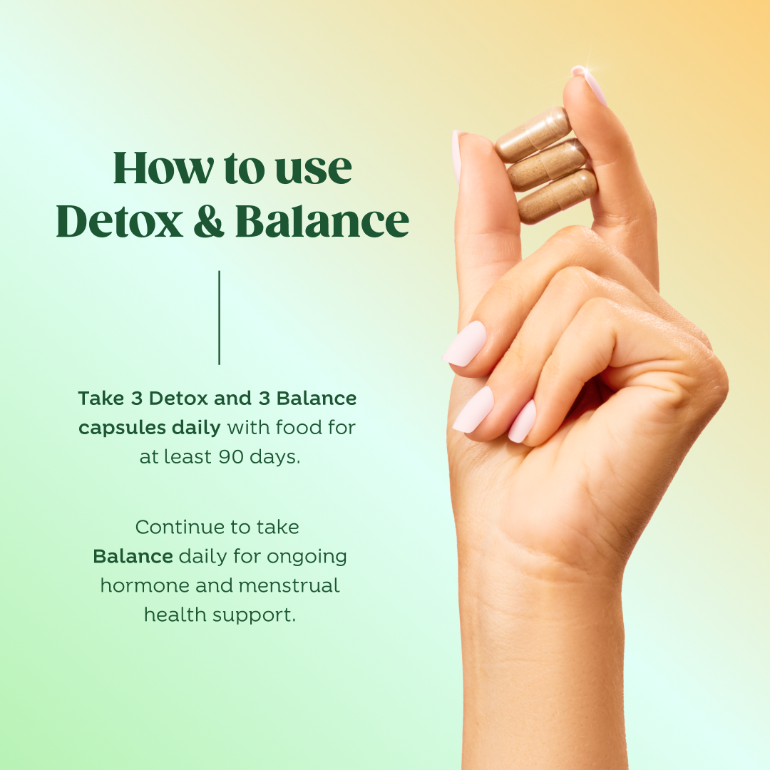Start your hormone health journey with a 30-day supply of Detox and Balance capsules. This innovative duo is expert-formulated with science-backed botanicals that work synergistically to deliver maximum hormone support.